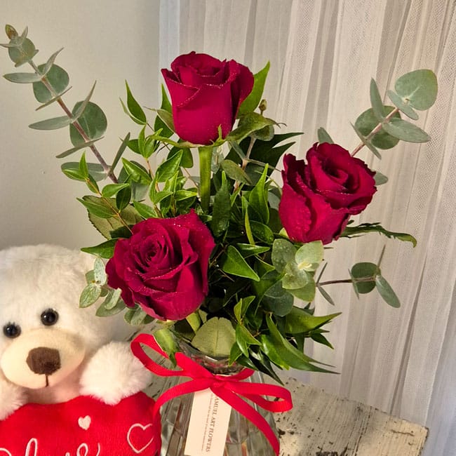 Spoil your loved one this Valentine’s Day with this charming arrangement featuring 3 roses in glass vase, includes cute Teddy Bear.