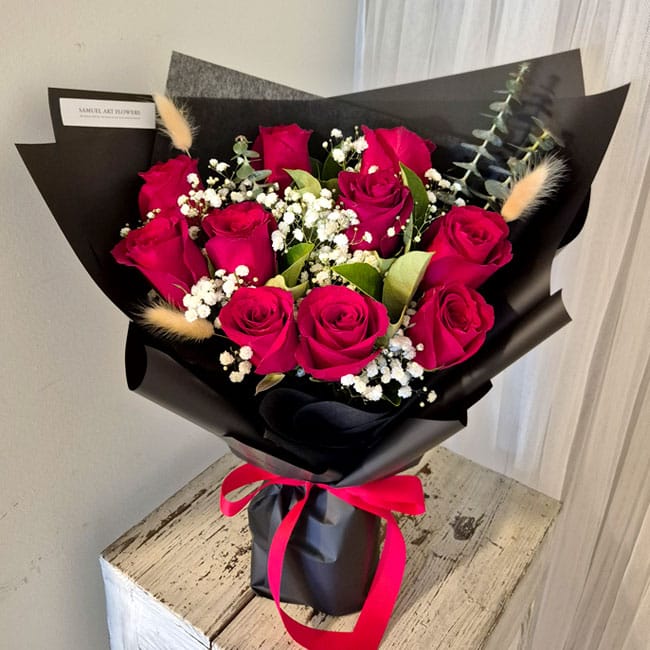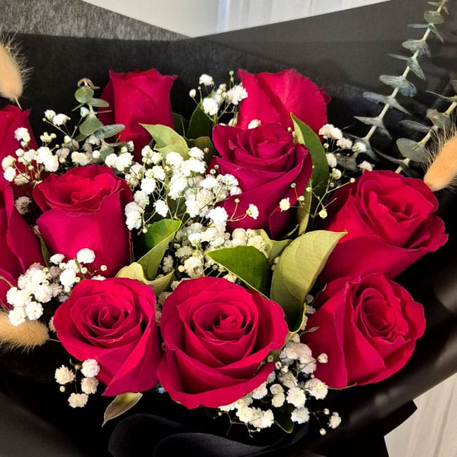 Classically romantic, our Simply Red Deluxe is the perfect way to express your affection for that special someone! It includes ten red roses with dried flower and gypsophila.